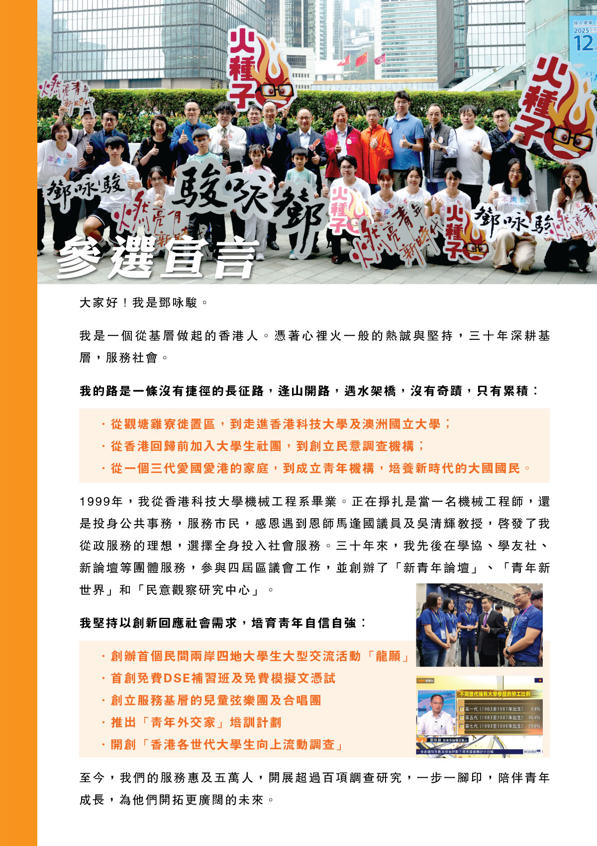 大家好!我是鄧咏駿。我是一個從基層做起的香港人。憑著心裡火一般的熱誠與堅持,三十年深耕基層,服務社會。